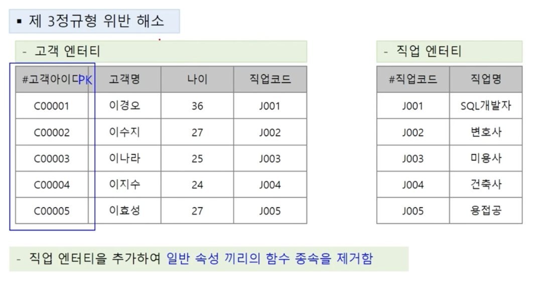 - 제 2정규형을 만족하는 상태에서 일반속성들간에도 종속관계가 존재하지 않아야 함