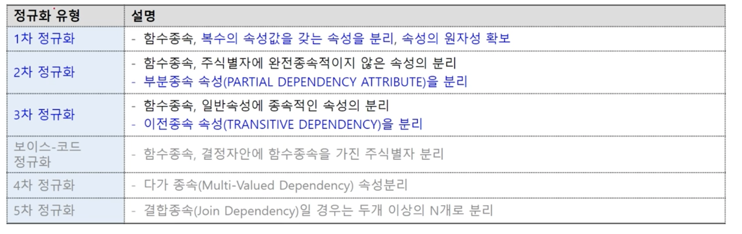 - 정규화를 수행한다는 것은 데이터를 결정하는 결정자에 의해 함수적 종속을 가지고 있는 일반 속성을 의존자로 하여 입력/수정/삭제 이상현상을 제거하는 것이다.