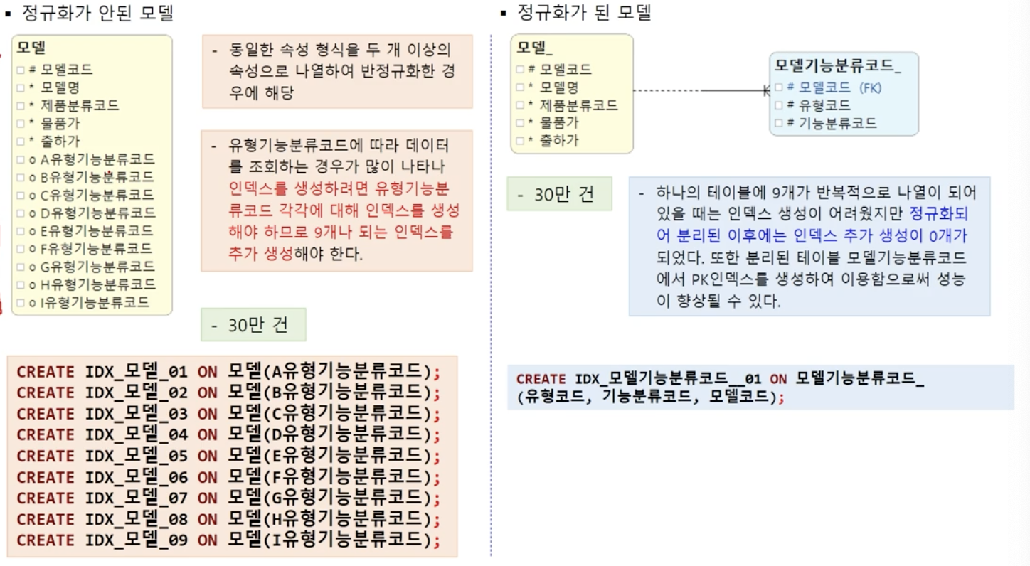 - 정규화가 제대로 되지 않으면 동일한 종류의 속성을 여러 개 가지고 있어서 과다한 인덱스가 만들어 질 수 있는데 정규화를 한다면 하나의 인덱스만 만들어도 된다.