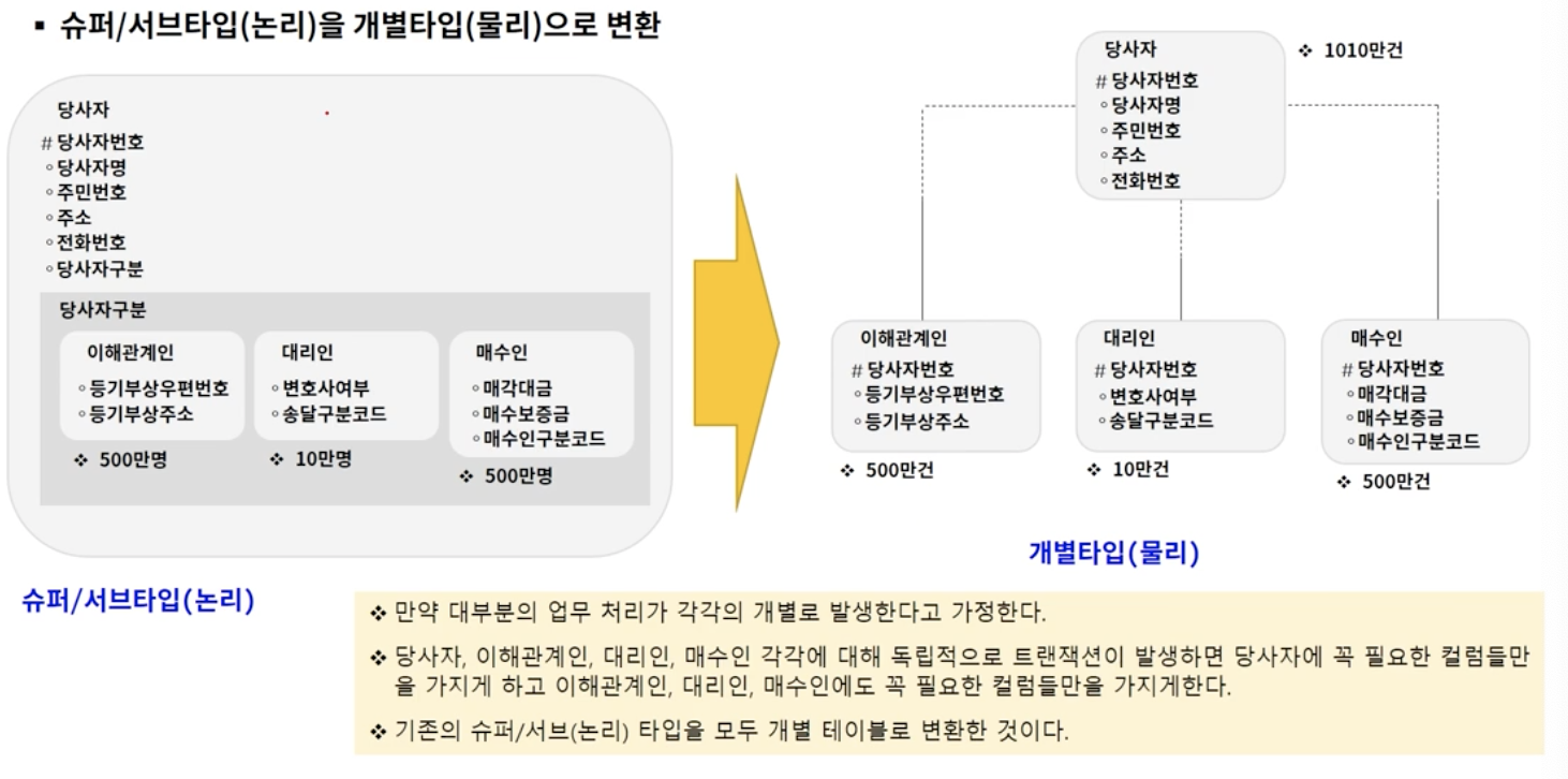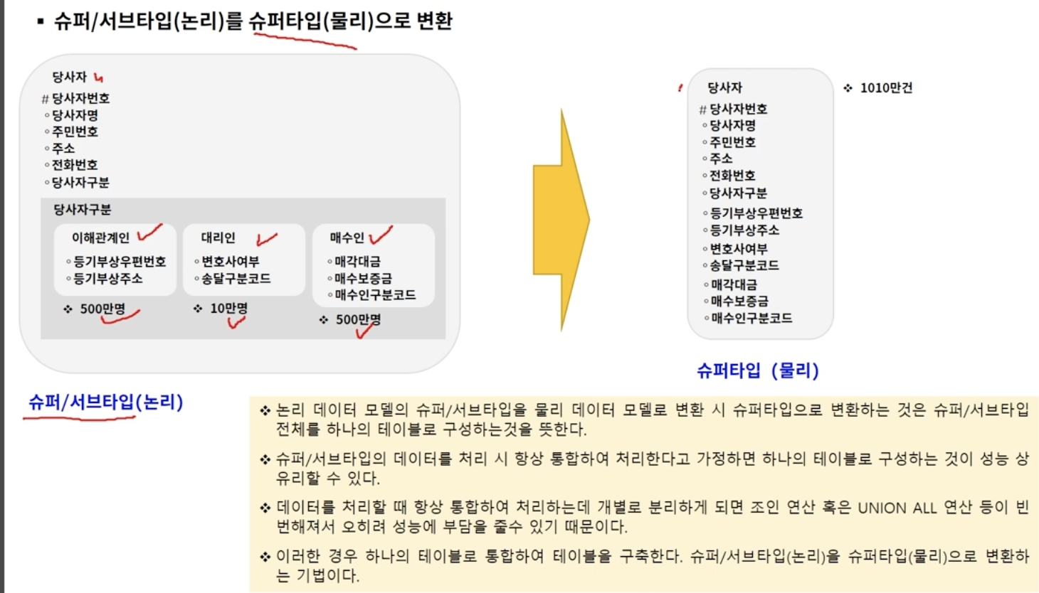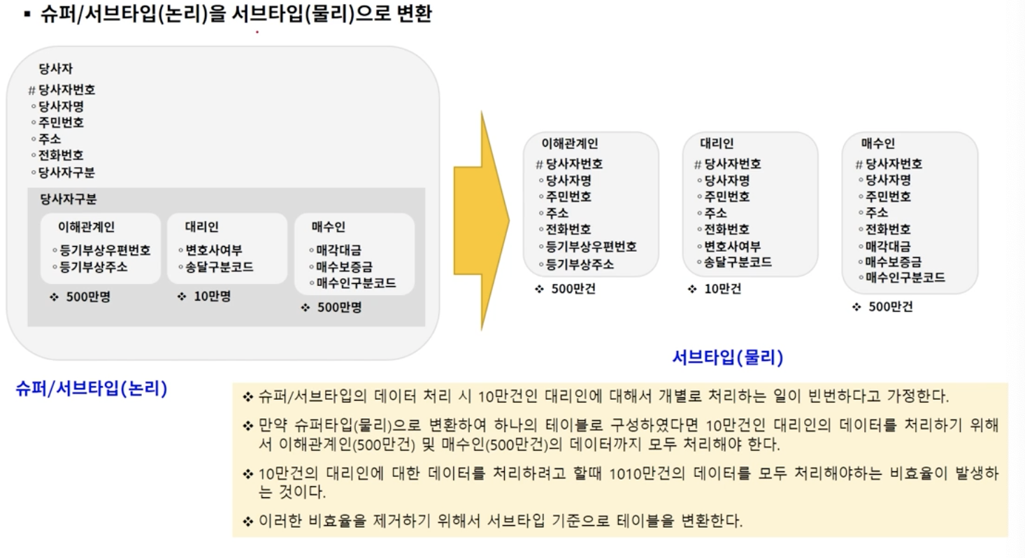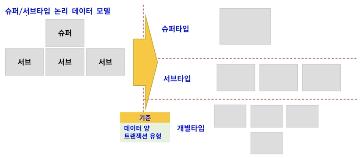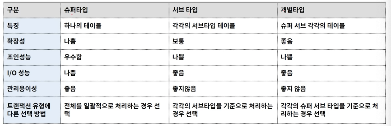 - 트랜잭션은 항상 서브타입을 기준으로 처리하는데 개별타입 혹은 슈퍼타입으로 되어 있는 경우 성능이 저하되는 경우가 있다. (서브타입기준으로 테이블을 구성하는 것이 유리한 경우이다.)
