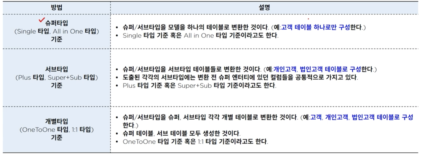슈퍼/서브타입 데이터 모델 변환 타입 비교