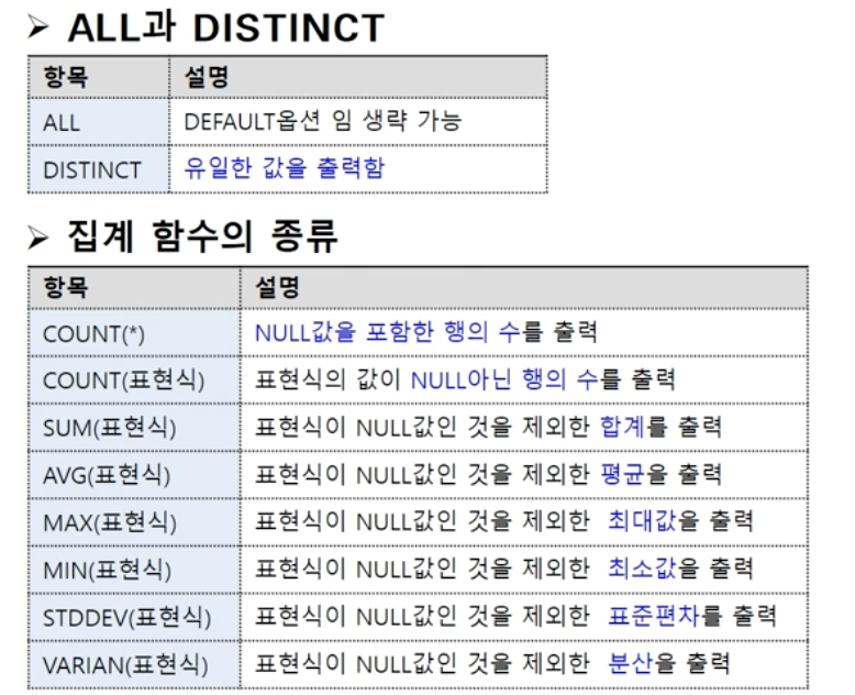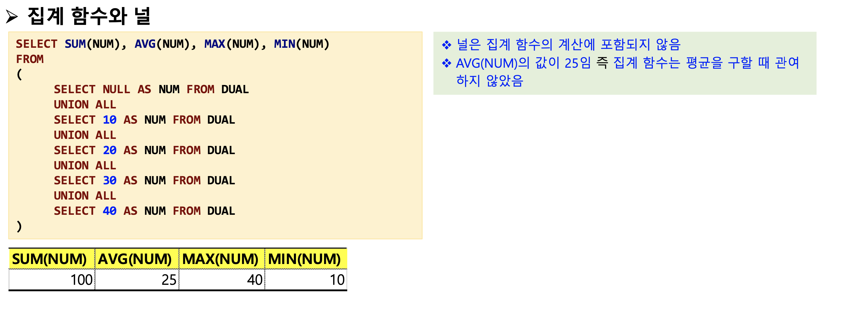 - 집계 함수의 통계 정보는 NULL 값을 가진 행을 제외하고 수행한다.
