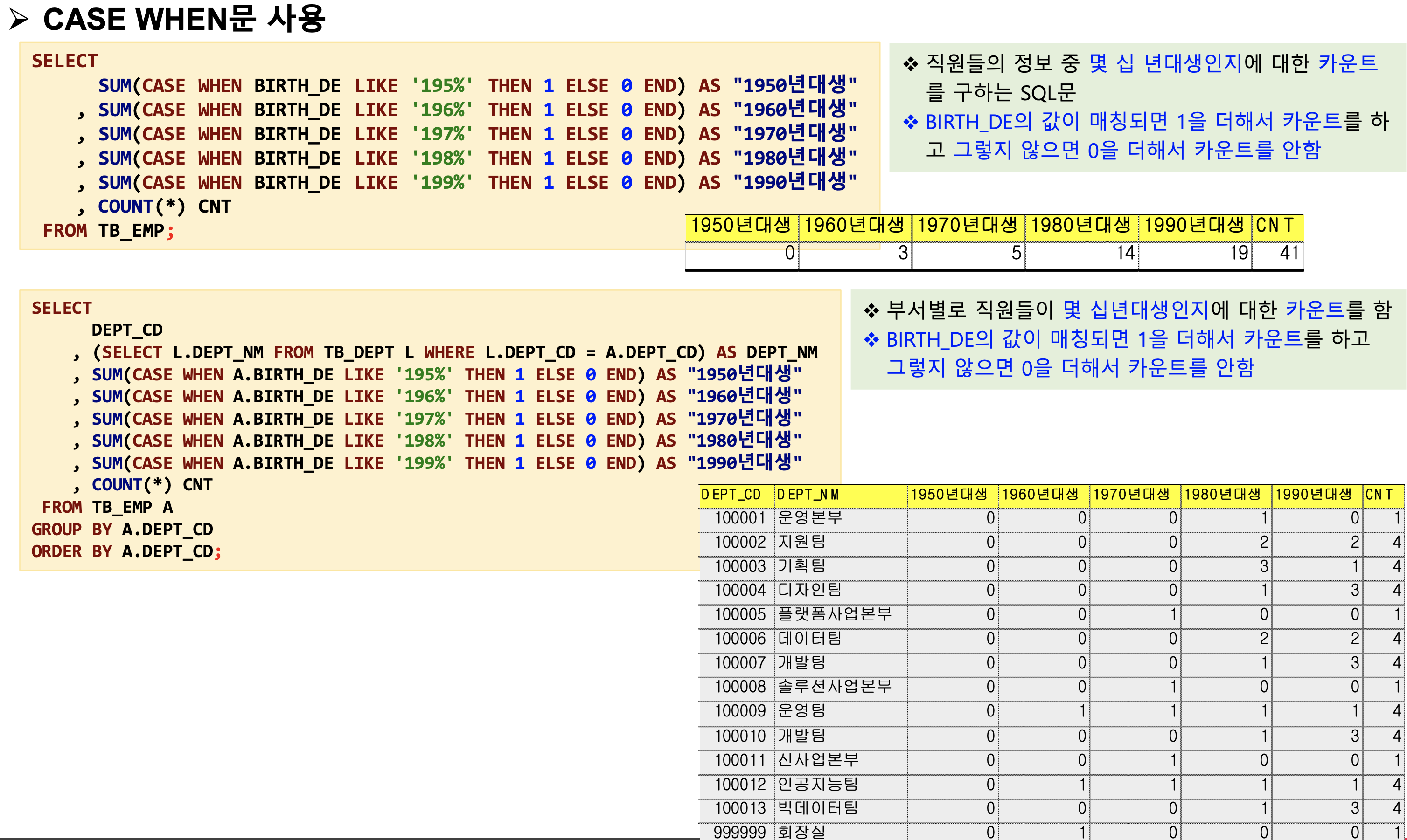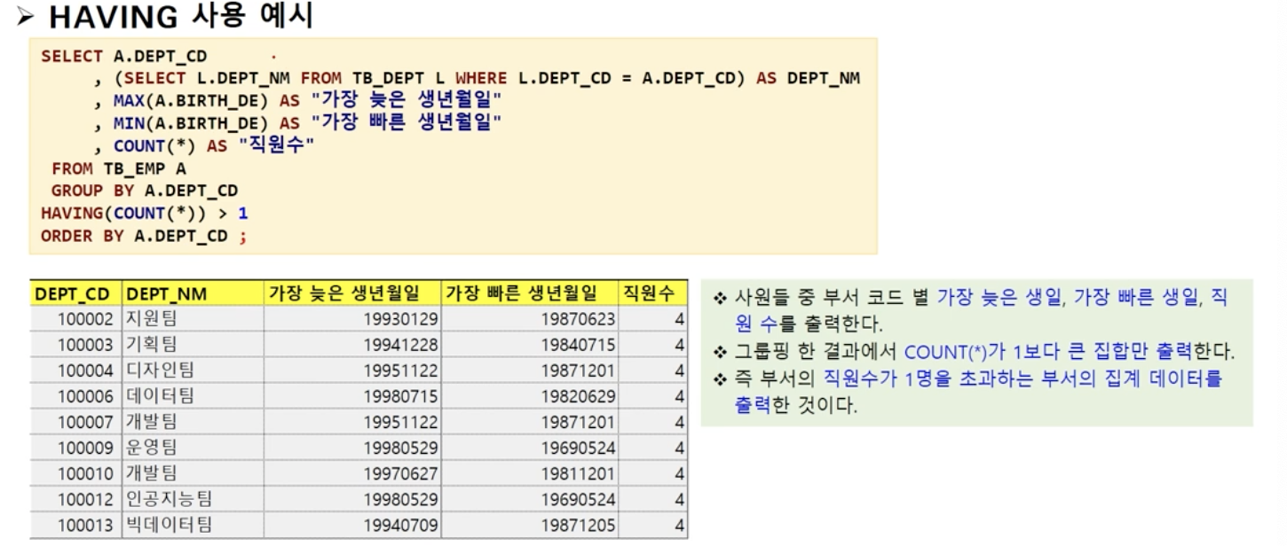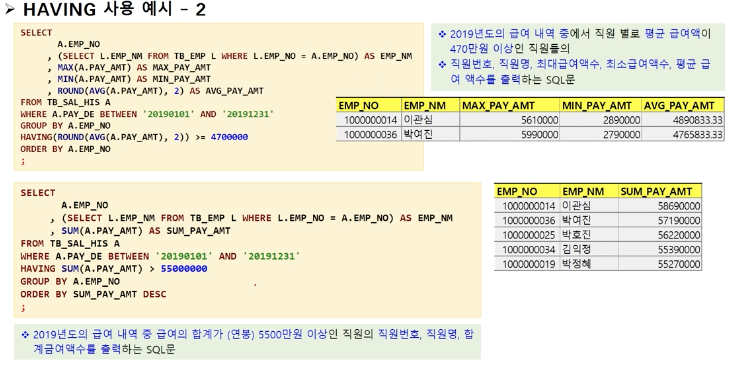 - HAVING 절은 GROUP BY 절의 기준 항목이나 소그룹의 집계함수를 이용한 조건을 표시할 수 있다.