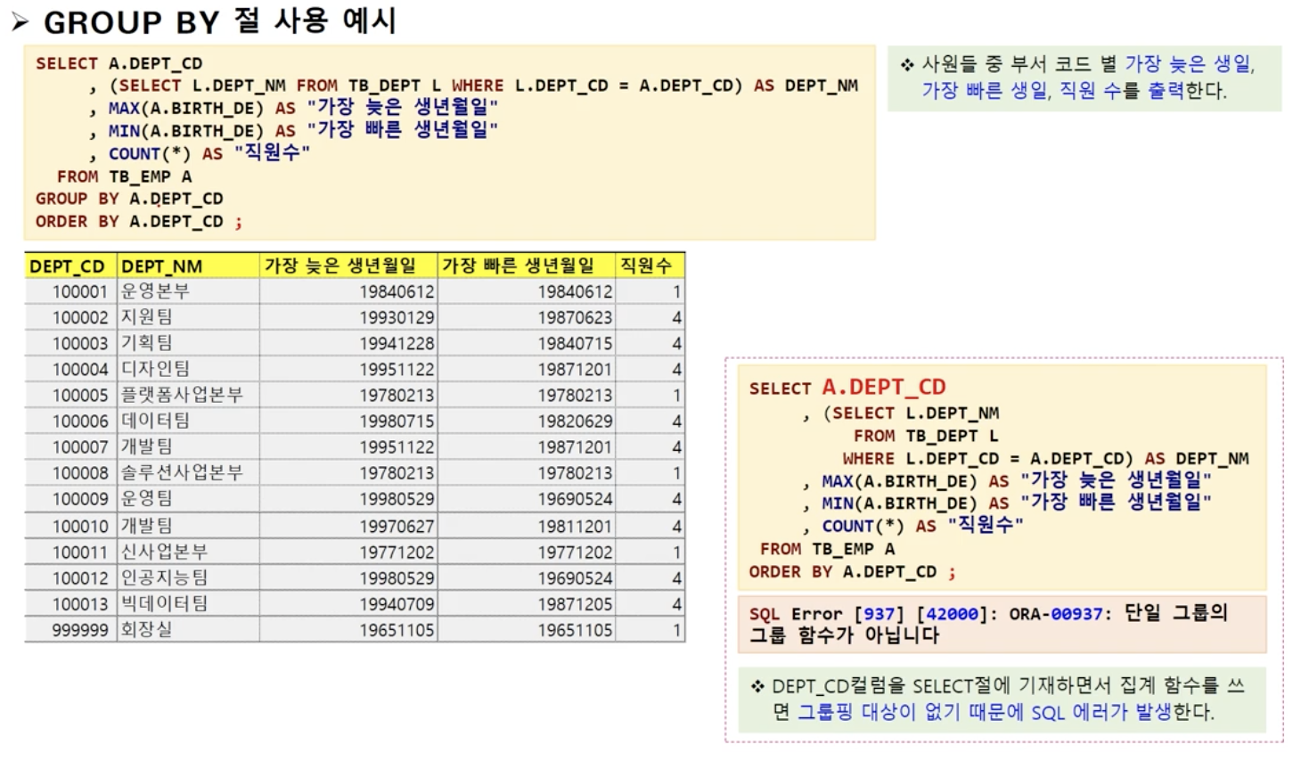 - GROUP BY 절에서는 SELECT 절과는 달리 ALIAS 명을 사용할 수 없다.