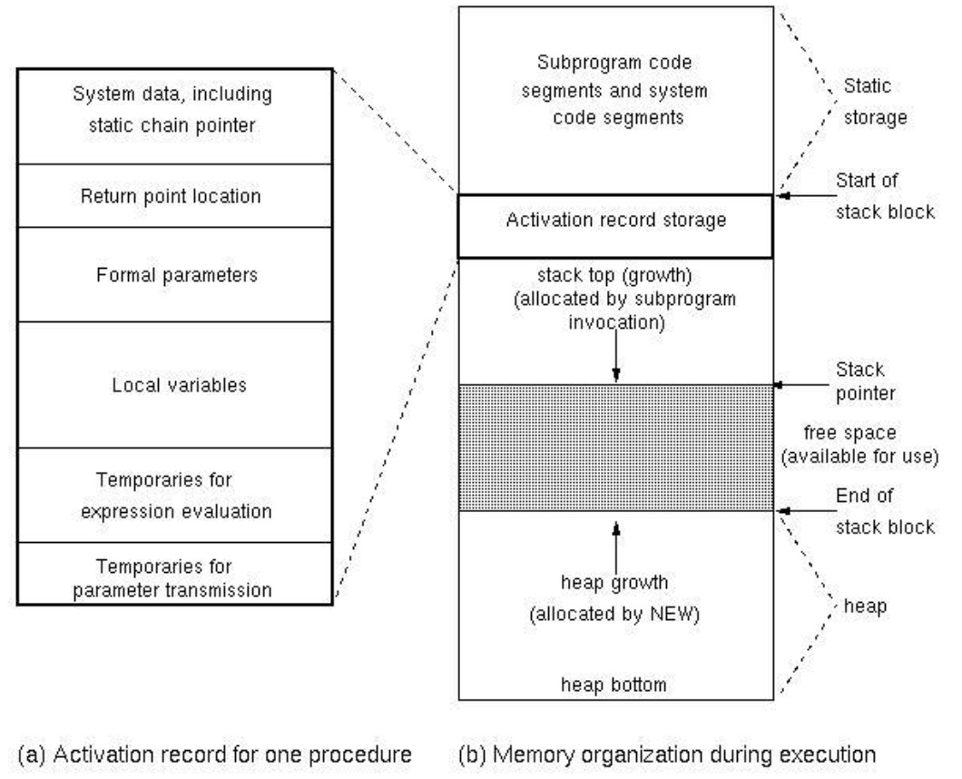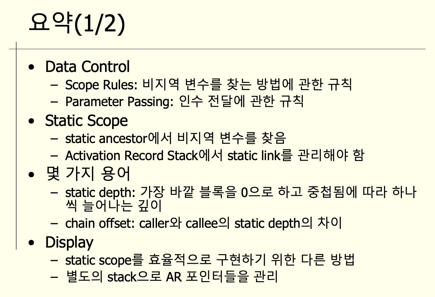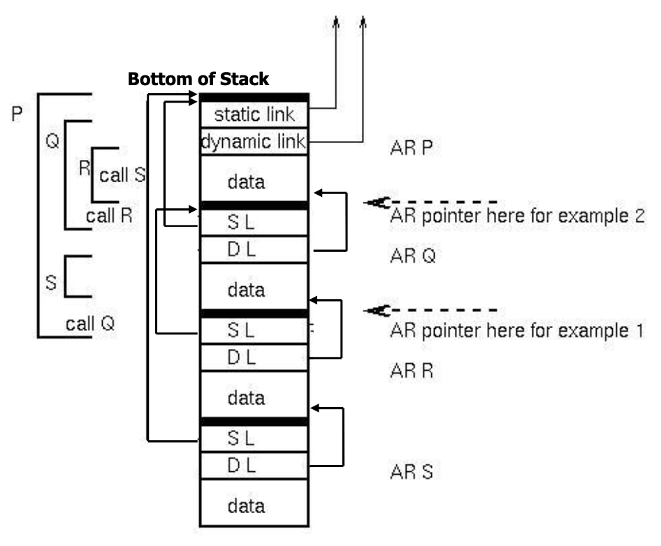 - Static Link Pointer: static parent의 AR을 가리킴. 정적영역규칙을 구현하기 위해 필요