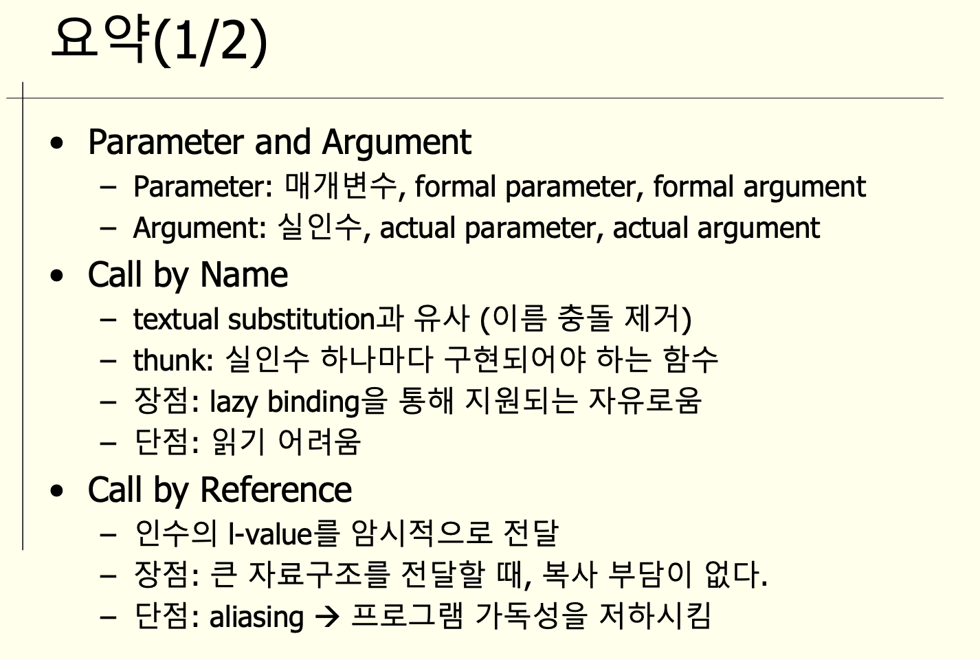 call by name은 함수호출때 값이 정해지는게 아니라 해당 변수가 나타났을 때 값을 가져온다.(그 외엔 call by value와 비슷)