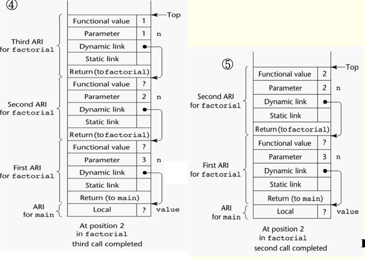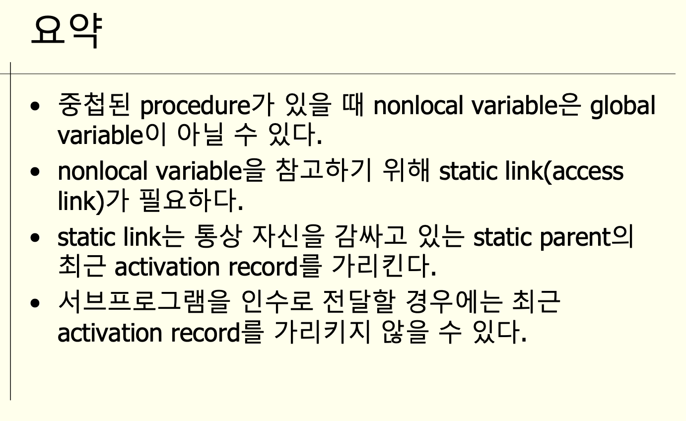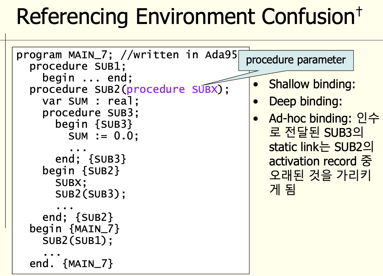- 인수로 전달된 SUB3의 static link는 SUB2의 activation record중 오래된 것을 가리키게 됨