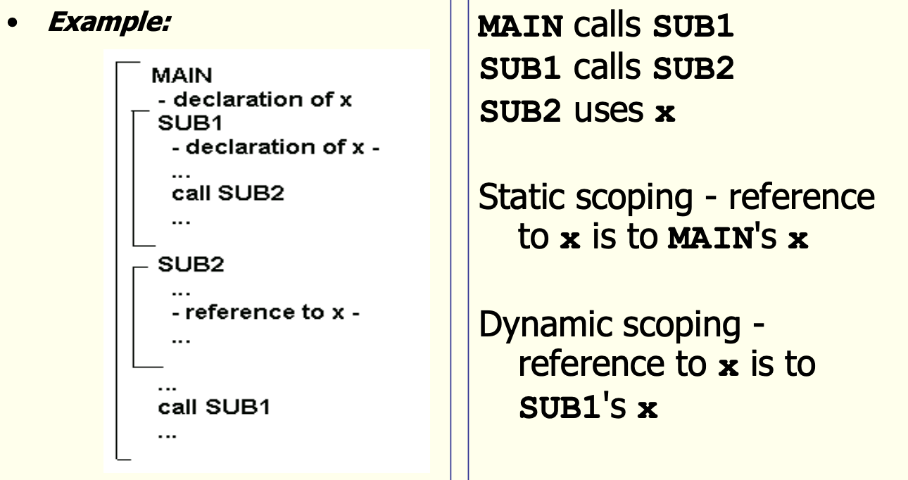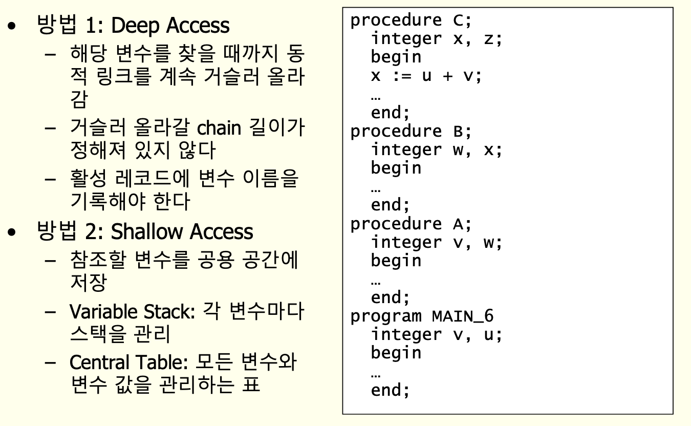 - Dynamic Scope Rule: 수행 중 변수의 scope 결정