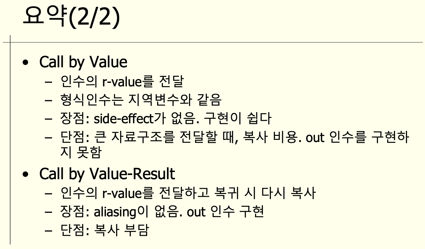 - 서브프로그램에서 복귀시, 매개변수의 r-value를 다시 실인수에 복사