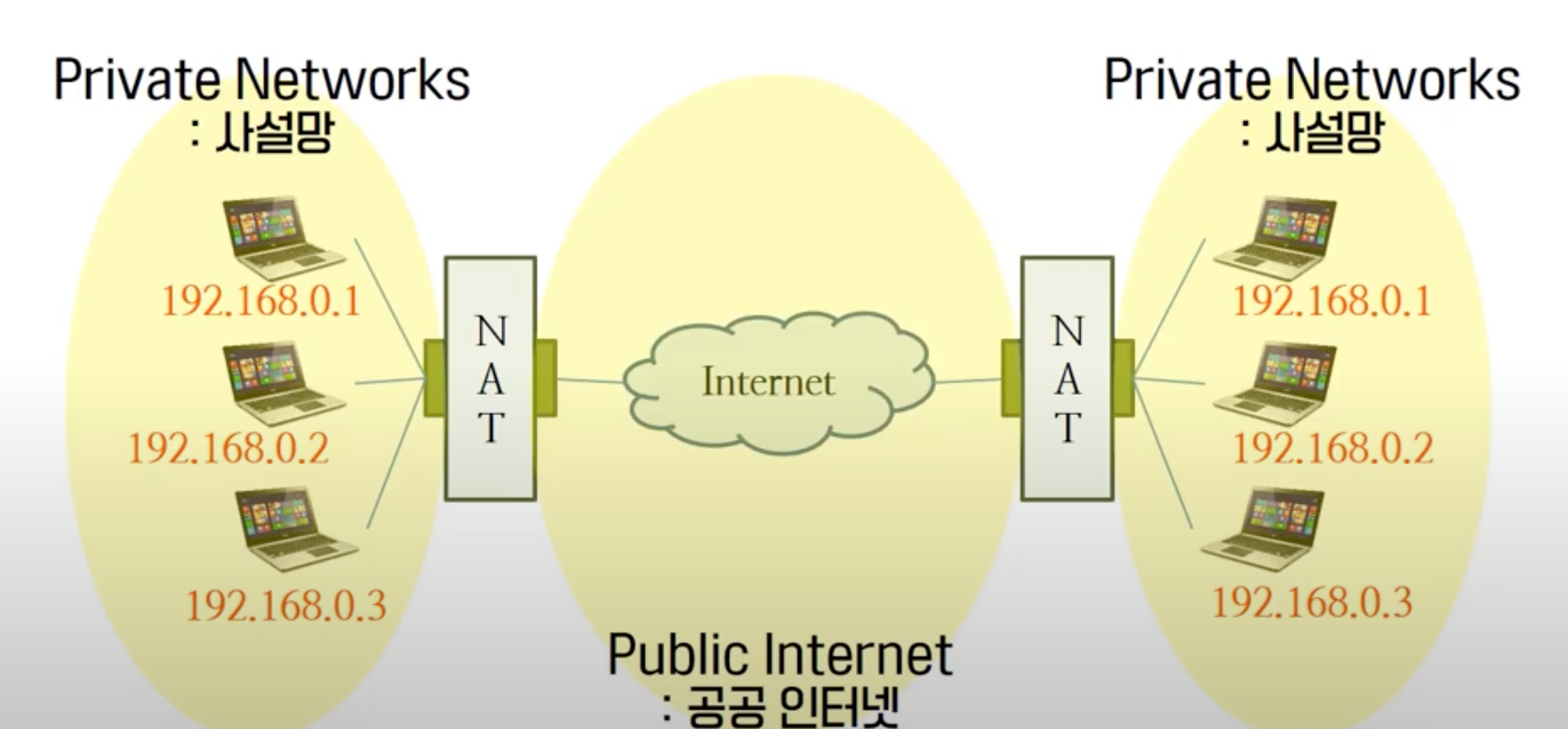 NAT (Network Address Translation) : 여러장비가 하나의 IP 주소를 공유하는 것