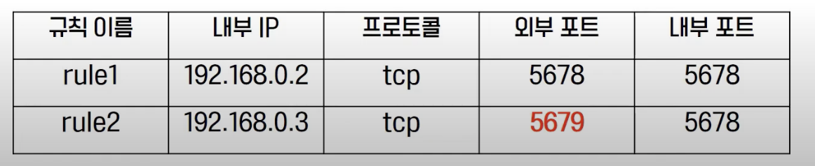 외부포트가 5678인 경우 A로 보내주고 , 5679인 경우 B로 보내준다. 결국 내부적으로 포트는 갖지만 구분하기 위해 설정으