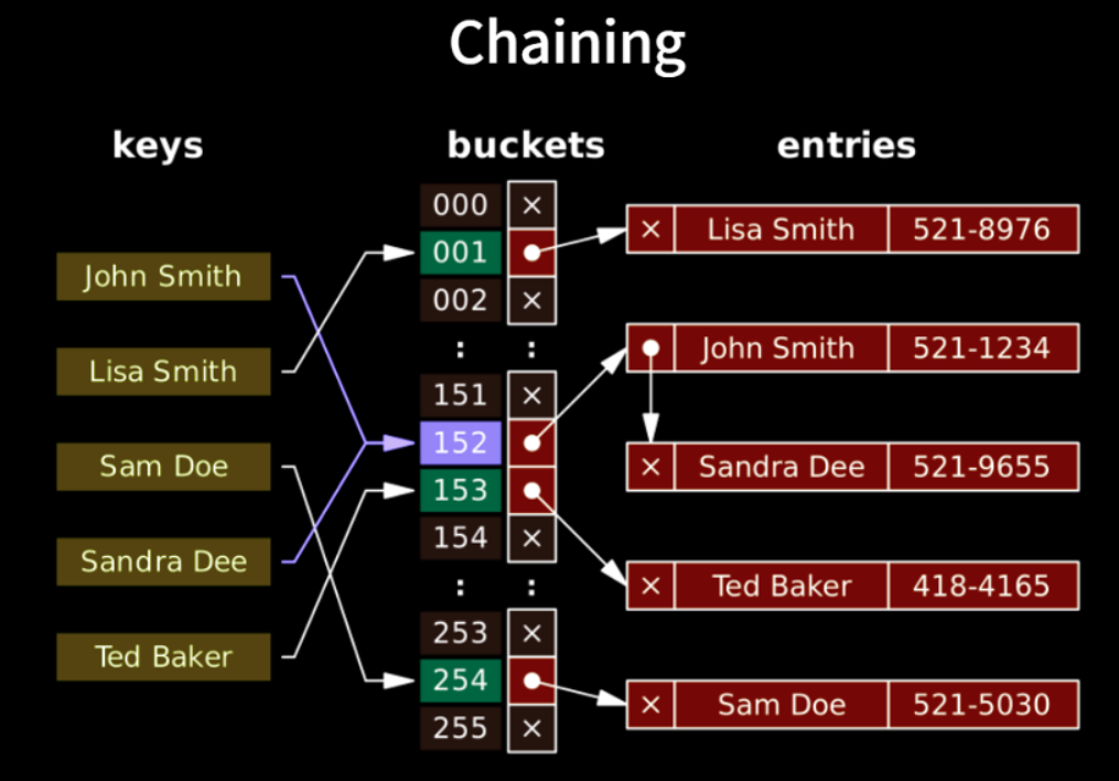 Chaining 방법은 해시 충돌이 발생했을 때 이를 동일한 bucket에 저장 하되 나중에 저장되는 값을 연결리스트 형태로 저장하는 방법입니다.