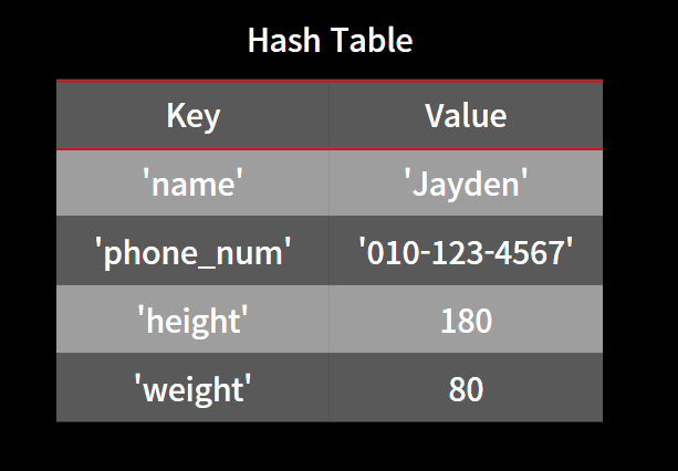 my_dict = {'name' : 'Jayden', 'phone_num' : '010-123-4567', 'heiht' : 180, 'weight' : 80}