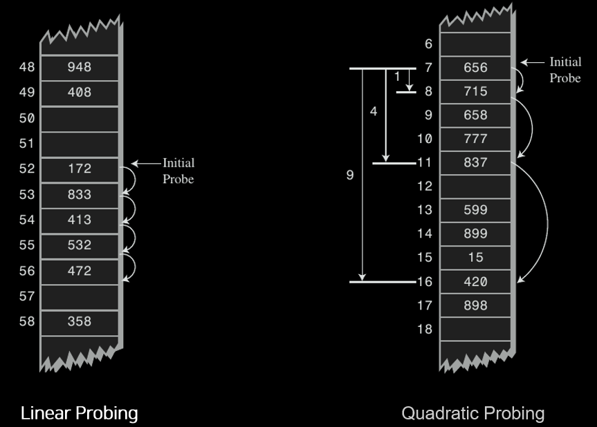 이 문제를 해결하기위해 을 건너뛰어 빈 공간(bucket) 를 찾아가는 quadratic probing 방법도 있습니다.
