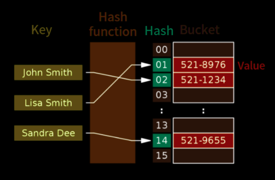 key 를 이용해 value 를 찾아내는 과정입니다. 먼저 key값과 hash function 을 이용해 hash 를 찾아내고 해당 hash 로 value 값을 찾을 수 있습니다.