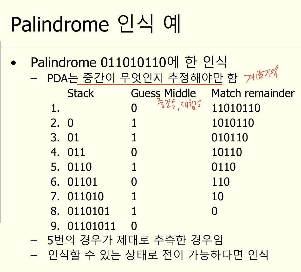 - Nondeterministic PDA와 Deterministic PDA가 인식하는 언어는 다르다.